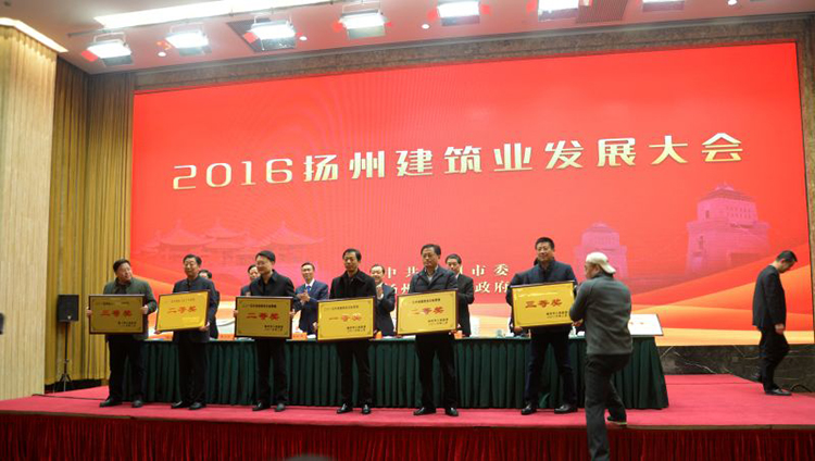 會(huì)議由聞道才副市長(zhǎng)主持,與會(huì)人員首先觀看了“十二五”揚(yáng)州建筑業(yè)發(fā)展專題片,聽取了朱民陽市長(zhǎng)所做的工作報(bào)告。然后市政府對(duì)2015年全市建筑業(yè)目標(biāo)管理獎(jiǎng)獲獎(jiǎng)單位和全市建筑業(yè)先進(jìn)企業(yè)、先進(jìn)個(gè)人進(jìn)行了表彰。建工控股公司獲得唯一的2015年市政府建筑業(yè)目標(biāo)管理一等獎(jiǎng),位列各縣(市)區(qū)之上,市委書記謝正義親自向陸金龍董事長(zhǎng)頒獎(jiǎng)。2015年全市僅有的兩項(xiàng)魯班獎(jiǎng)工程均由江蘇華建創(chuàng)造,宗有農(nóng)總經(jīng)理、吳士茂主席上臺(tái)領(lǐng)獎(jiǎng)。此外,江蘇華建還有4名員工分別被市政府表彰為優(yōu)秀建造師、優(yōu)秀班組長(zhǎng)。