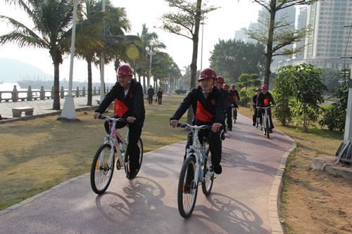 2012年元旦,珠海公司開展騎自行車迎新年活動。機關全體員工統(tǒng)一著裝,頭戴印有江蘇華建標識的安全頭盔,騎著統(tǒng)一插有江蘇華建小紅旗的自行車,從珠海海濱浴場出發(fā),沿著海濱綠道,一直騎往終點淇澳島,來回全程56公里。無論是年近6旬的老員工,還是剛工作不久的新員工,個個爭先恐后,奮勇向前??妵鴺锌偨?jīng)理身先士卒,騎行在隊伍的最前面。這支特殊的“騎兵隊”在新年的第一天飛馳在珠海的海濱綠道上,引導車上醒目的江蘇華建大旗迎風招展,每輛車前面的小紅旗也分外引人注目,形成了一道亮麗的風景線,引得許多路人和游客紛紛駐足觀望,有的攝影愛好者用鏡頭記錄下這美麗的一刻。