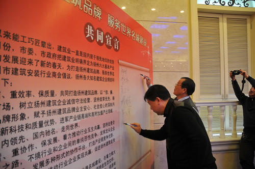 建安商會(huì)常務(wù)副會(huì)長(zhǎng)吳士茂代表商會(huì)理事會(huì)作工作報(bào)告,秘書長(zhǎng)戴壯民介紹了華建聯(lián)盟成立一年來的運(yùn)行情況,主席臺(tái)上的各位領(lǐng)導(dǎo)為10個(gè)新進(jìn)會(huì)員代表頒發(fā)證書。副會(huì)長(zhǎng)曹德榮宣讀了市建安商會(huì)《打造“揚(yáng)州建筑”品牌,服務(wù)世界名城建設(shè)共同宣言》,然后所有會(huì)長(zhǎng)單位負(fù)責(zé)人一起上臺(tái)簽署《共同宣言》,表達(dá)了共同打造揚(yáng)州建筑品牌、抱團(tuán)包容發(fā)展、擔(dān)當(dāng)建設(shè)秀美揚(yáng)州生力軍的共同愿望。