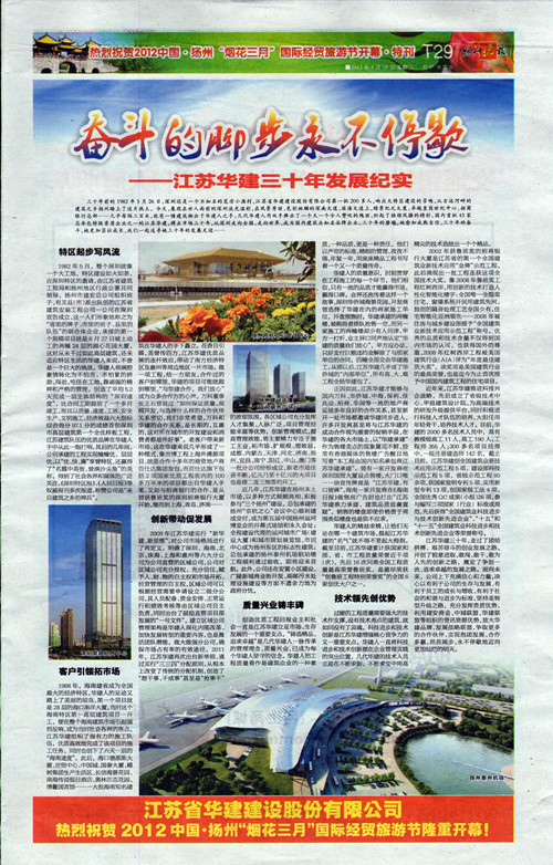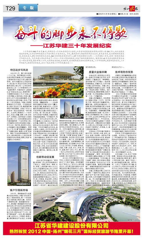 《揚(yáng)州晚報(bào)》專版刊發(fā)公司三十周年宣傳文章 時(shí)間:2012-04-19 4145 4月18日,《揚(yáng)州晚報(bào)》T29版刊發(fā)專版文章《奮斗的腳步永不停歇——江蘇華建三十年發(fā)展紀(jì)實(shí)》,從公司起步、市場(chǎng)開拓、創(chuàng)新發(fā)展、質(zhì)量與科技等各個(gè)層面,介紹了公司三十年的奮斗歷程、綜合實(shí)力和發(fā)展業(yè)績(jī)。