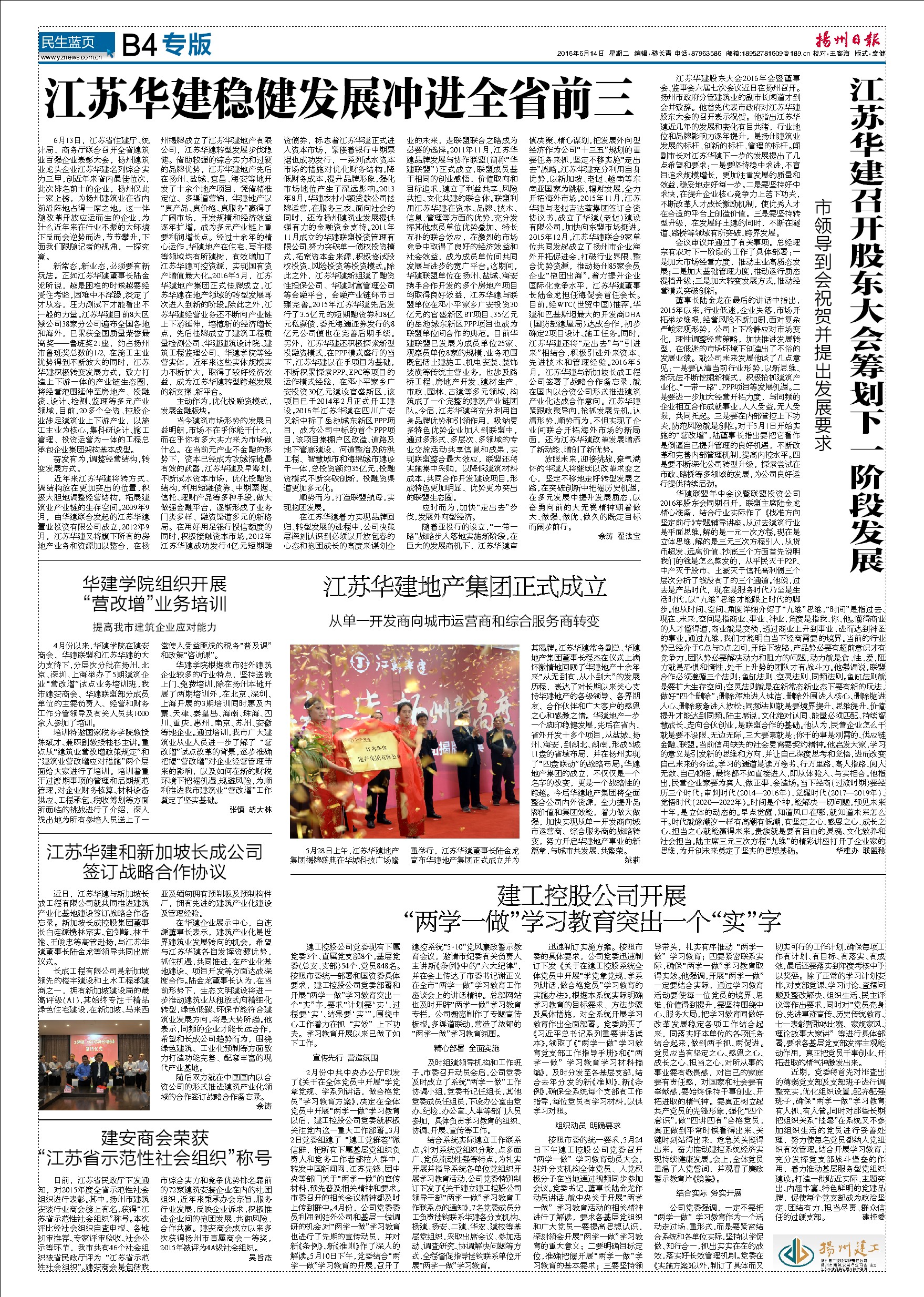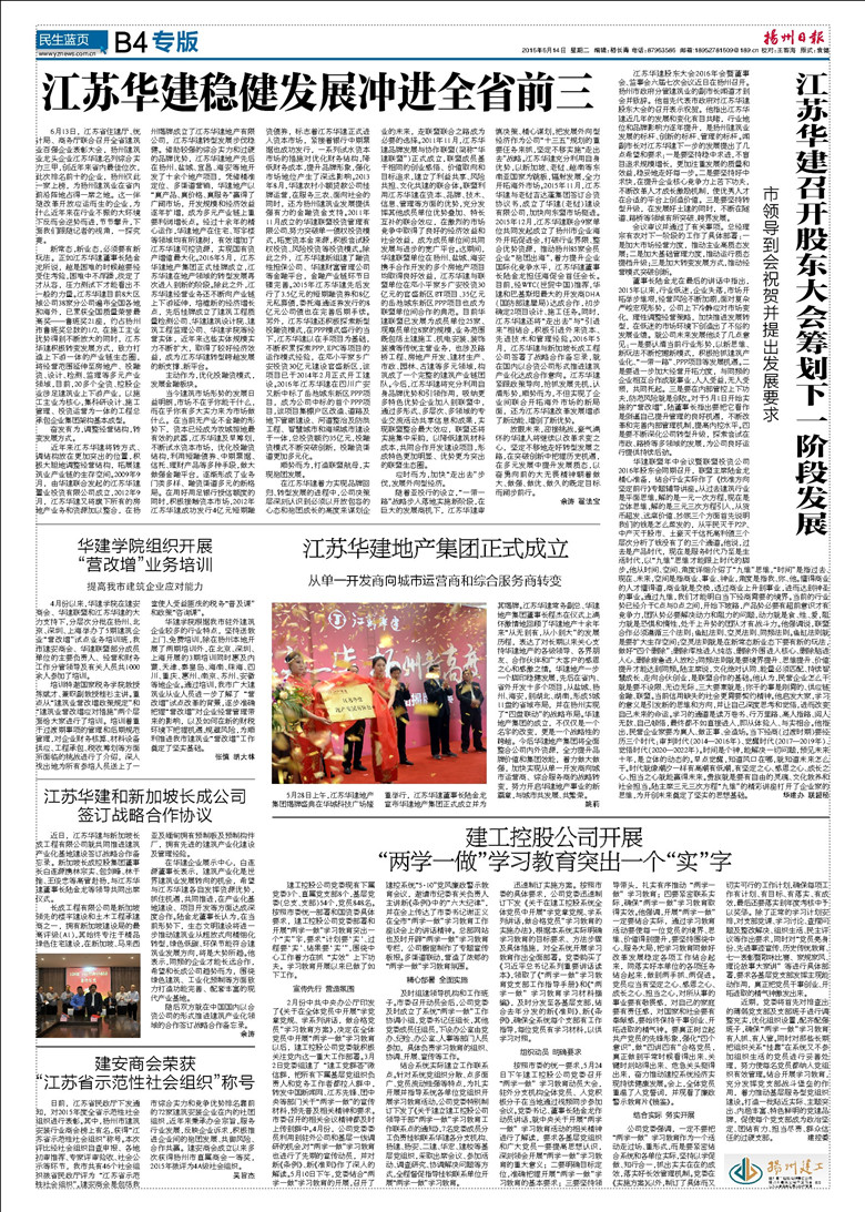 今日《揚(yáng)州日報》刊登專版文章報道華建進(jìn)入全省前三有關(guān)消息 時間:2016-06-14 3205 今天出版的《揚(yáng)州日報》B4“揚(yáng)州建工”專版刊登了江蘇華建穩(wěn)健發(fā)展沖進(jìn)全省前三、華建股東大會、華建地產(chǎn)集團(tuán)成立、“兩學(xué)一做”學(xué)習(xí)教育等相關(guān)文章,歡迎關(guān)注。
