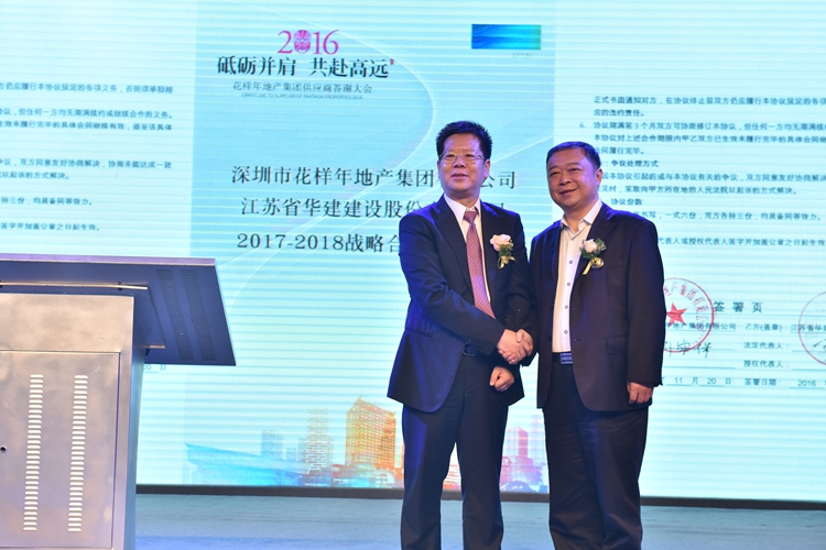 答謝大會上,王宏董事長代表江蘇華建與花樣年地產(chǎn)集團總裁劉宗保簽署了雙方戰(zhàn)略合作框架協(xié)議,同時,江蘇華建以與花樣年地產(chǎn)集團合作時間最早、合作期限最久贏得了本次大會新設的唯一“鉆石級供應商”最高大獎,蔣超代表公司上臺捧回獎杯證書。