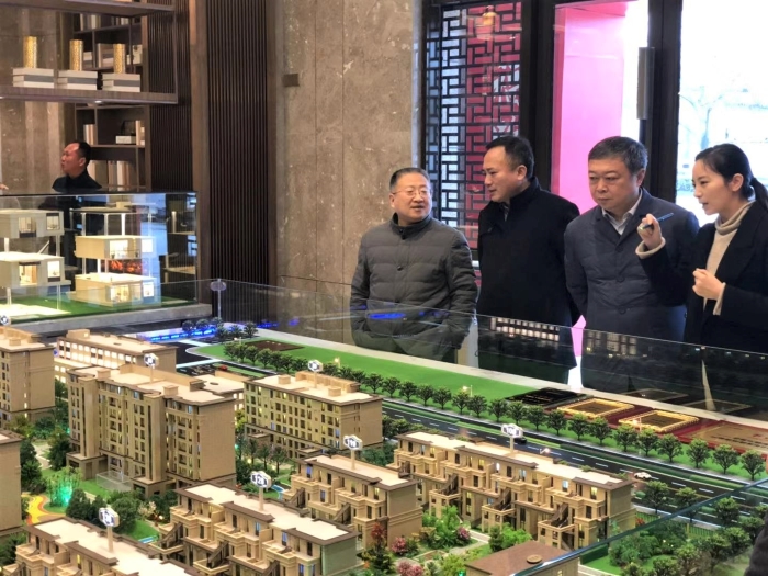 王宏董事長首先考察了華建乾院項目,在售樓處聽取了項目開發(fā)、銷售的進(jìn)度報告,詳細(xì)了解了小區(qū)戶型特點(diǎn)和配套情況,并針對一些產(chǎn)品細(xì)節(jié)提出完善意見。