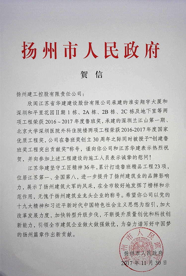 11月30日,揚(yáng)州市人民政府專門發(fā)來(lái)賀信,對(duì)公司承建的淮安翔宇大廈、深圳和平里花園Ⅱ期1棟 、2A棟、2B棟、2C棟及地下室兩工程榮獲2016-2017年度魯班獎(jiǎng);深圳蘭江山第一期、北京大學(xué)深圳醫(yī)院外科住院樓兩工程榮獲2016-2017年度國(guó)家優(yōu)質(zhì)工程獎(jiǎng),以及在魯班獎(jiǎng)創(chuàng)立30周年大會(huì)上被授予“創(chuàng)建魯班獎(jiǎng)工程突出貢獻(xiàn)獎(jiǎng)”稱號(hào),表示熱烈祝賀,并向參加上述工程建設(shè)的施工人員表示誠(chéng)摯的慰問。