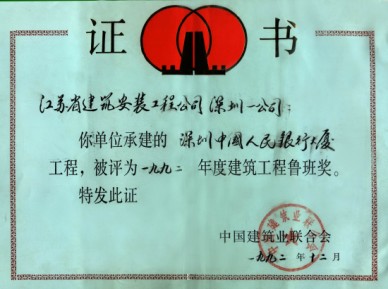 該工程位于深圳深南大道蔡屋圍地段,地上12層,地下室1層、高度48.6米,建筑面積21715平方米,于1987年1月破土動(dòng)工,1989年8月竣工交付。工程由大型金庫(kù)、營(yíng)業(yè)大廳、外匯交易所、電腦主機(jī)房、辦公室和多功能會(huì)議廳等組成,大廈前庭鋪設(shè)30級(jí)花崗石臺(tái)階,兩邊各設(shè)有50平方米的瀑布、噴泉,門庭內(nèi)外各4根8.6米高的巨型金屬圓柱,采用不銹鋼鏡面裝飾,墻面大理石天然絲紋拼接,大廳配有4部電梯。除照明外,還配有電視、電話、廣播音響、消防自動(dòng)報(bào)警、自動(dòng)噴灑滅火、1211氣體消防等先進(jìn)裝置。工程先后榮獲1991年度深圳市優(yōu)質(zhì)樣板工程、江蘇省優(yōu)質(zhì)工程(金獎(jiǎng))、江蘇省名牌工程和1992年度中國(guó)建筑工程“魯班獎(jiǎng)”。