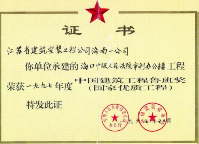??谑兄屑?jí)人民法院審判辦公樓位于海口市金宇路8號(hào),1995年4月竣工,1996年6月被評(píng)為海南省優(yōu)質(zhì)工程,并榮獲海南省優(yōu)秀建筑二等獎(jiǎng),1997年12月榮獲1997年度建筑工程魯班獎(jiǎng)。
